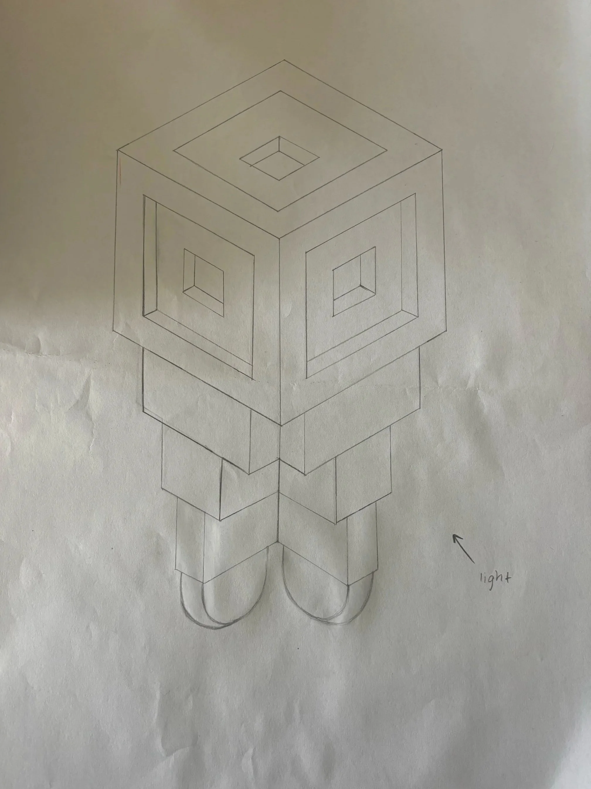 The first resource was created by using lined isometric paper - creating the outline of the design with a 30 degree set square. This was to demonstrate to students the level of complexity/detail required, and roughly the amount of elements that the Robot should include given the students are working with time constraints.